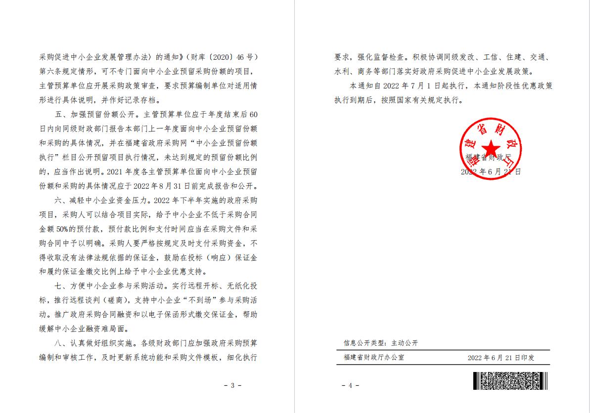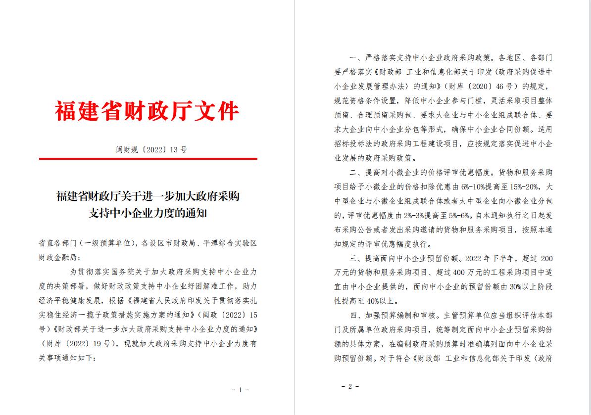 福建省財政廳關(guān)于進一步加大政府采購支持中小企業(yè)力度的通知